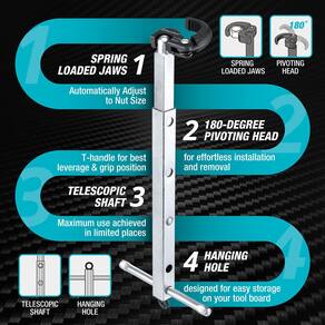 DURATECH Chave telescópica para lavatório - A chave de lavatório possui uma mandíbula de ajuste automático com mola para operação com uma mão em locais estreitos, adequada para torneiras, linhas de suprimento, válvulas e ralos com um diâmetro de porcas de 0,9 a 3,5 cm. A haste telescópica se ajusta rapidamente em comprimento de 25,4 cm. até 43 cm. Para atender às suas necessidades no local de trabalho - Através de rotação de 180°, a mandíbula com mola ajusta automaticamente seu tamanho e mantém sua posição em qualquer ângulo, permitindo que você navegue em torno de obstáculos e porcas difíceis de alcançar - O eixo de aço forte oferece um alcance de 25 a 43 cm e é fino o suficiente para passar por tubos e linhas de drenagem em espaços apertados. Uma alça de barra em "T" deslizante oferece várias posições para a melhor alavancagem e aderência mais confortável - A haste telescópica se ajusta rapidamente em comprimento de 25 a 43 cm. O eixo telescópico de quatro posições se adapta a qualquer situação pressionando um botão, travando no lugar a 25 cm. 30 a 48 cm. 35,5 a 150 cm. e 43 cm. comprimentos - O design da alça telescópica e a alça de alta alavancagem permitem armazenamento compacto na gaveta ou caixa de ferramentas. O orifício traseiro para pendurar é projetado para facilitar o armazenamento em sua placa de ferramentas, uma ferramenta de encanamento essencial para seus projetos