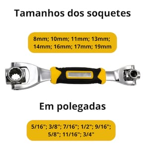 Material: Aço inox + punho emborrachadoCabeças: Rotativas em 360° com inclinação de 45°Tamanhos dos soquetes: Métrico e polegadaTipos de cabeças compatíveis: Quadradas, pentagonais, hexagonais, anis, dodecagonaisPunho: Emborrachado, antiderrapanteIdeal para: