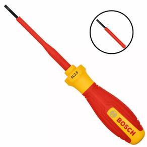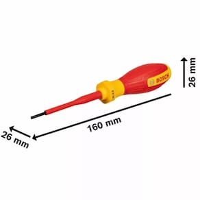 A Chave VDE Fenda SL 3,5 x 75 mm 1600A02NC1000 BOSCH é indicada para apertar e desapertar parafusos de fenda em aplicações profissionais, oferecendo segurança mesmo em caso de contato acidental com partes sob tensão. Trata-se de uma ferramenta padronizada, desenvolvida para atender aos requisitos de trabalhos elétricos com alto nível de confiabilidade.
