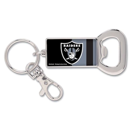 Chaveiro com Abridor de Garrafa OAKLAND RAIDERS - NFL O chaveiro com abridor de garrafas licenciado oficialmente é feito com latão niquelado com decoração e um acessório de garra de lagosta no anel de divisão. Perfeito para decorar e pendurar suas chaves, além de te ajudar a abrir aquela garrafa quando mais for preciso. Tamanho: 8cm x4cm Material: Metal Marca: WinCraft Time: OaklandRaiders Importado e Licenciado Oficialmente pela NFL