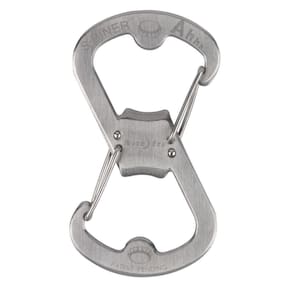 Chaveiro em aço inox com abridor de garrafas e mosquetão duplo. Dimensões: 80.95mm x 44.73mm x 7.32mm