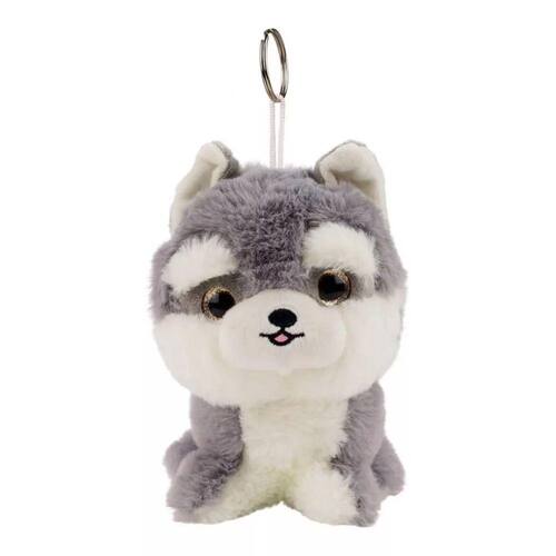 Bichinho de pelúcia no formato de um cachorro Husky com chaveiro. Cachorro de pelúcia tem 17 cm de altura. Olhos de plástico com purpurina dentro. Material: poliéster; Enchimento: fibra de poliéster; Produto certificado por Órgão acreditado pela CGCRE do INMETRO
