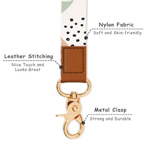 ?Materiais duráveis e macios?O chaveiro é feito de náilon durável, fivela de liga metálica e couro premium, fecho de metal de qualidade e chaveiros, o torna mais sólido e durável e pode manter o uso a longo prazo. O nylon e o couro hipoalergênicos não agridem a pele e são adequados para uso prolongado.