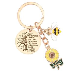 Material: aço inoxidável Tamanho: girassol 1,7* 1,5 cm, abelha 2,1* 1,95 cm; peso: 25 g Design elegante de girassol e abelha — chaveiro lindamente feito com pingente de girassol, pingente de abelha e citação gravada para uma aparência brilhante e poderosa. Mensagem inspiradora — O disco de aço inoxidável está gravado com “Eles sussurraram para ela que você não aguenta a tempestade. Ela sussurrou de volta “Eu sou a tempestade”, simbolizando força e confiança. Material premium — Feito de aço inoxidável durável e liga de esmalte, garantindo brilho duradouro, resistência à corrosão e um toque confortável. Acessório versátil — perfeito para colocar nas chaves do carro, bolsas, mochilas ou bolsas, adicionando um toque estiloso e motivacional aos itens do dia a dia. Charme significativo para mulheres — Um acessório chique e elegante para mulheres e meninas que apreciam designs florais e mensagens empoderadoras.