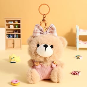 Material: pelúcia e metal Tamanho: 9,5* 14,5* 7,5 cm Peso: 59 g 🧸 Design encantador de ursinho de pelúcia — Apresenta um ursinho fofo vestindo um macacão rosa estilo veludo e um laço xadrez, criando um acessório fofo e moderno para uso diário. Material macio e durável — Feito de tecido de pelúcia premium e hardware de metal resistente, garantindo um toque confortável e qualidade duradoura. Linda combinação de cores — Os tons pastel de bege, rosa e xadrez adicionam uma aparência calorosa e alegre, perfeita para complementar estilos femininos ou divertidos. Acessório versátil — funciona como chaveiro, chaveiro ou chaveiro para chaves de carro, chaves de casa ou como pingente decorativo para mochilas, bolsas e bolsas. Tamanho portátil perfeito — mede aproximadamente 9,5 × 14,5 × 7,5 cm e pesa cerca de 59 g, o que o torna leve e atraente para transportar em qualquer lugar.
