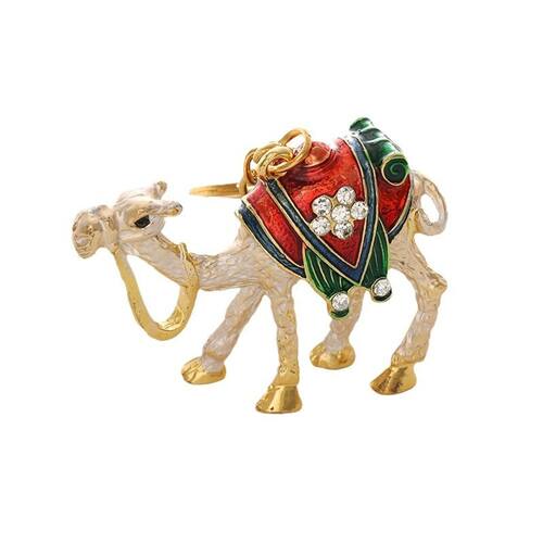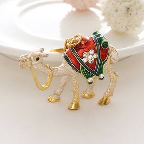 Material: liga e strass Tamanho: 4* 5,5 cm Peso: 33 g Design elegante em camelo — Apresenta um camelo lindamente detalhado com uma sela esmaltada vermelha e verde, simbolizando resistência e charme exótico. Enfeites de strass brilhantes — Decorados com cristais cintilantes no selim, criando uma aparência metálica luxuosa e atraente. Construção em liga de alta qualidade — Feita de liga de zinco durável com revestimento de ouro para brilho duradouro, resistência à corrosão e fabricação robusta. Decoração multiuso — ideal para usar como chaveiro de carro, pingente de bolsa ou pingente de mochila, adequada para homens e mulheres que gostam de designs exclusivos inspirados em viagens. Compacto e elegante — Leve e refinado, este chaveiro adiciona sofisticação e um toque de personalidade aos seus acessórios ou coleções diárias.