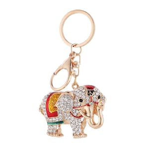 Material: liga de zinco Tamanho: 5,4* 4,3 cm Peso: 48,5 g Design elegante de elefante — Apresenta um elefante lindamente criado coberto de strass cintilantes com detalhes em esmalte vermelho, amarelo e verde para uma aparência vibrante e exótica. Material de liga de zinco durável — Feito de metal resistente com revestimento dourado que resiste a manchas e retém seu brilho, garantindo um uso duradouro. Símbolo de força e sorte — O design do elefante representa proteção, sabedoria e boa sorte, tornando-o um acessório significativo para o estilo cotidiano. Uso versátil — Funciona como um elegante chaveiro, chaveiro ou chaveiro para organizar as chaves do carro, as chaves da casa ou como um pingente para bolsas, carteiras e mochilas. Compacto e atraente — mede aproximadamente 5,4 × 4,3 cm e pesa cerca de 48,5 g, o que o torna leve e luxuoso para carregar tanto homens quanto mulheres.