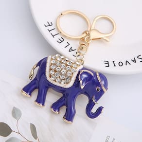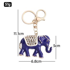 Material: metal Tamanho: 6,8* 5 cm Peso: 51 g Design elegante de elefante — Apresenta um gracioso elefante esmaltado azul decorado com cristais cintilantes, simbolizando sabedoria, força e boa sorte. Artesanato premium — Feito de liga e strass de alta qualidade com detalhes finos, garantindo um acabamento durável e polido que resiste ao desbotamento e às manchas. Elegante e atraente — A cor azul brilhante combinada com detalhes dourados cria uma aparência refinada e luxuosa, adequada para qualquer ocasião. Prático e decorativo — perfeito para usar como chaveiro de carro, pingente de bolsa ou pingente de mochila, adicionando um toque de classe aos seus acessórios. Compacto e durável — Medindo 6,8 × 5 cm e pesando 51 g, este chaveiro de elefante é sólido, fácil de transportar e ideal para quem aprecia designs artísticos.
