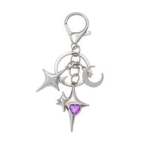 Material: liga de zinco Tamanho: 2* 8 cm Peso: 18 g Design de inspiração celestial — Apresenta um tema chique de lua e estrela com uma delicada pedra preciosa de coração roxo no centro, adicionando charme e elegância. Material de liga premium — Feito de liga de zinco durável com acabamento suave em tom prateado, resistente a manchas e projetado para um brilho duradouro. Elegante e leve — compacto com 8 × 2 cm e pesando apenas 18 g, este chaveiro é confortável de transportar e fácil de colocar em seus pertences. Acessório moderno — perfeito para decorar bolsas, bolsas ou chaves de carro, oferecendo uma estética cósmica moderna para o uso diário. Significado simbólico — A combinação de lua e estrela representa sonhos, orientação e amor, tornando-a uma peça ideal para quem gosta de estilos místicos ou românticos.