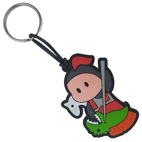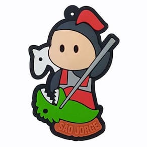 Chaveiro emborrachado com imagem de São Jorge e argola de metal prata.