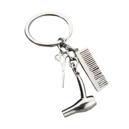 Material: liga de zinco Tamanho: 1-6 cm Peso: 20 g Tema de cabeleireiro encantador: este chaveiro apresenta versões em miniatura de ferramentas essenciais de cabeleireiro: tesoura, secador de cabelo e pente, perfeito para barbeiros, estilistas e amantes da beleza. Liga de zinco durável: feito de liga de zinco de alta qualidade, este chaveiro é leve, mas forte, projetado para uso duradouro sem perder o brilho ou o estilo. Perfeito para profissionais de beleza: ideal para cabeleireiros, barbeiros ou qualquer pessoa que trabalhe na indústria da beleza, este chaveiro adiciona um toque de diversão e profissionalismo aos seus acessórios. Compacto e prático: medindo de 1 a 6 cm e pesando apenas 20 g, este chaveiro é pequeno e portátil, facilmente fixado em bolsas, chaveiros ou mochilas sem adicionar peso extra. Elegante e funcional: esteja você presenteando um profissional de beleza ou usando para si mesmo, este chaveiro serve como um acessório prático e estiloso que reflete sua paixão pelo cabeleireiro.