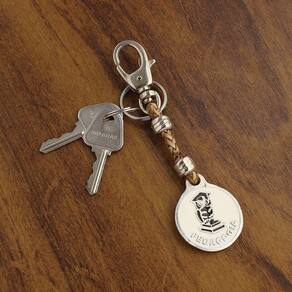 Chaveiro Rodeo West modelo Pedagogia, fabricado em couro e metal com banho cromo e detalhes em alta definição, possui mosquetão e acabamento em fundo branco e preto.