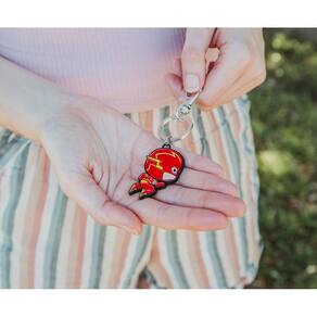 - SUPER DESIGN: o pingente de chaveiro apresenta uma versão chibi estilizada do Flash contra seu icônico logotipo de raio.