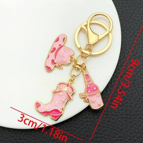 Material: liga de zinco Tamanho: 3* 9 cm Peso: 15,1 g Design de inspiração ocidental — Apresenta botas de cowboy esmaltadas rosa, chapéu e pingentes de garrafa acentuados com detalhes dourados e pequenos motivos de estrelas para uma atmosfera ocidental divertida. Material de liga de zinco durável — Feito de metal de alta qualidade com revestimento de esmalte liso, garantindo cor, brilho e resistência duradouros ao desbotamento. Elegante e leve — mede 3 × 9 cm e pesa apenas 15,1 g, o que o torna compacto e atraente para uso com chaves de carro, bolsas ou mochilas. Acessório moderno — combina design divertido com artesanato elegante, perfeito para mulheres que gostam de detalhes estilosos e criativos. Fácil de colocar e transportar — vem com um fecho resistente e um chaveiro, facilitando a fixação em zíperes, bolsas ou conjuntos de chaves.