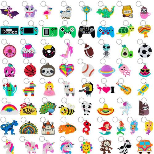 - O pacote inclui: chaveiros infantis em massa incluem chaveiros de 65 peças, nos estilos mostrados na imagem, como chaveiros com alça de jogo, chaveiros de controle de jogo, chaveiros de dinossauro, chaveiros de sorvete, chaveiros de beisebol, chaveiros de basquete, chaveiros de unicórnio que brilham no escuro e outros chaveiros de borracha. Variedade de estilos, quantidades suficientes, adequados para uso pessoal e necessidades de festas.