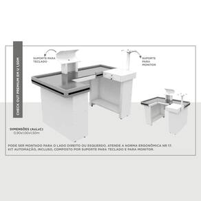 Incluí gaveta multiuso e kit automação, composto por suporte para teclado e para monitor. Não possui recorte para balança e não inclui porta cédulas. Pode ser montado tanto para o lado direito quanto para o esquerdo.