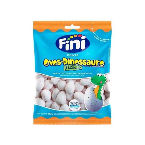 Pacote contendo gomas de mascar Fini Ovos de Dinossauro sabor Tutti Frutti, colorido e aromatizado artificialmente. Peso líquido 230 gramas.