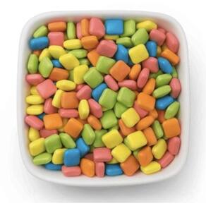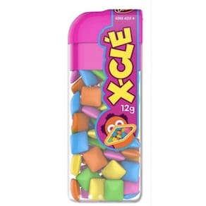 Caixa contendo 12 potinhos com Mini chiclete XCLÉ sabor tutti frutti de 12 gramas cada. Peso total da embalagem 144 gramas.