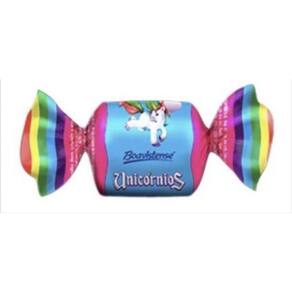 Caixa contendo aproximadamente 46 unidades de chiclete tijolinho Happy Bol sabor Algodão Doce com figurinhas do tema Unicórnio com 3 gramas cada. Peso total da embalagem 140 gramas.