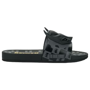 Slide com enfeite que contempla e representa o lado mais misterioso do Batman, usando como foco, sua máscara. Aplique em Full plastic para ter um toque mais macio e também possui alguns chanfros que intercalam com uma textura de nylon acetinado, brincando assim com o fosco e o polido base do material. Na sola o ícone do personagem repetidas vezes e, no centro temos a sua assinatura, deixando o calçado ainda mais divertido!