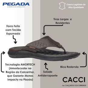 O chinelo é confeccionado com couro de alta qualidade, proporcionando durabilidade e uma sensação suave ao toque. Sua leveza é um diferencial, conferindo uma experiência de uso agradável e facilitando a mobilidade ao longo do dia.