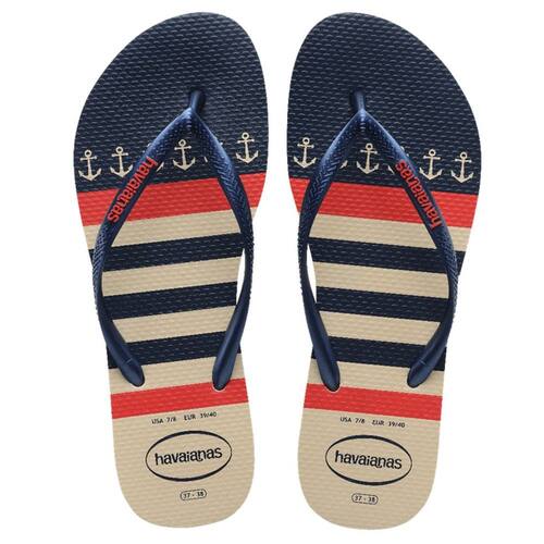 A Havaianas Top Nautical traz todo o charme do estilo náutico com releituras de vários listrados. Seja em azul, branco e vermelho ou em listras com um veleiro no mix, esse chinelo é uma ótima escolha para quem é do mar. Opção perfeita para quem é fã do estilo náutico, as Havaianas Slim Nautical deixam os pés lindos graças à sua sola e tiras fininhas. Com uma cartela de cores clássica e atemporal, além de estampas marítimas, mescla tons de azul-marinho e prata.