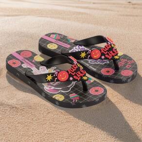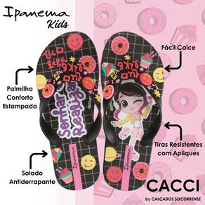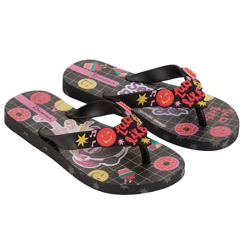 Ícones como emojis e rosquinhas divertem o Ipanema Luluca em um aplique nas tiras que é cheio de irreverência e vai fazer a cabeça das meninas. A carismática personagem aparece em destaque na grafia da palmilha, envolta dos mesmos ícones.