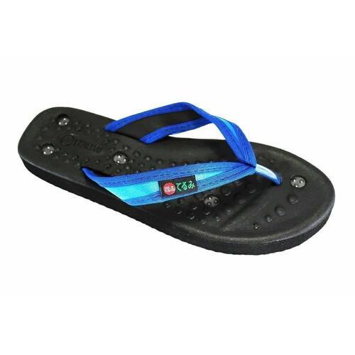 Detalhe Técnico: Sandália Magnética Kelly Terumi – Tecnologia, Conforto e Bem-Estar Integrados As Sandálias Magnéticas Kelly Terumi foram desenvolvidas com materiais de alta qualidade, unindo ergonomia, estilo e benefícios terapêuticos para o uso no dia a dia. Seu design anatômico conta com saliências macias estrategicamente posicionadas, que estimulam suavemente as terminações nervosas nas solas dos pés. Esse estímulo proporciona uma massagem reflexológica contínua, auxiliando na melhora da circulação sanguínea, no alívio de tensões acumuladas e estimula o equilíbrio corporal. Com 14 magnetos distribuídos conforme os pontos da reflexologia podal e da técnica oriental Doin, as sandálias favorecem a harmonização dos fluxos energéticos do organismo, contribuindo para uma sensação prolongada de bem-estar, vitalidade e relaxamento. Seu salto baixo e estrutura versátil permitem o uso confortável em diversas ocasiões, tornando-a uma aliada ideal para quem busca saúde, conforto e elegância no dia a dia. Cor: Cabedal Azul / Solado Preto.