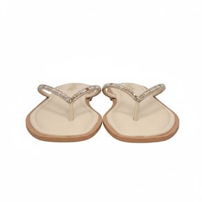 Aviso: Há divergência entre o título e as imagens fornecidas. O título menciona "Chinelo Dedo Flor de Minas Strass Metalizado PE2132/2244", mas as imagens mostram chinelos com solado quadrado, palmilha metalizada e tiras com strass, um com acabamento prateado e outro em tom nude. A descrição será gerada com base nas imagens.