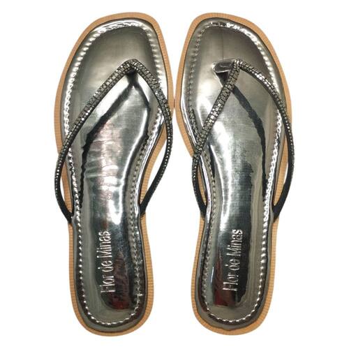 Aviso: Há divergência entre o título e as imagens fornecidas. O título menciona "Chinelo Dedo Flor de Minas Strass Metalizado PE2132/2244", mas as imagens mostram chinelos com solado quadrado, palmilha metalizada e tiras com strass, um com acabamento prateado e outro em tom nude. A descrição será gerada com base nas imagens.