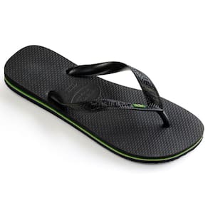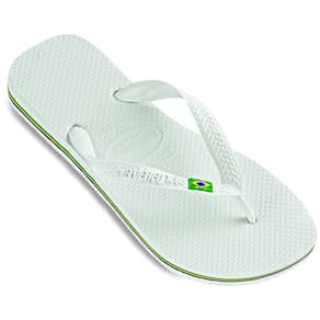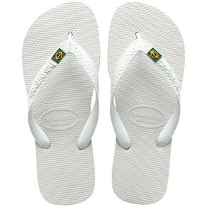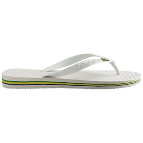 O modelo tradicional da Havaianas ganha a bandeira do Brasil nas tiras e um filete colorido.
