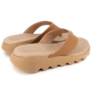 Chinelo plataforma com cabedal em napa valise na cor tan. O modelo possui tecnologia Sola+Conforto, um solado com altura entre 2 e 4cm de salto que distribui o peso corporal na pisada.
