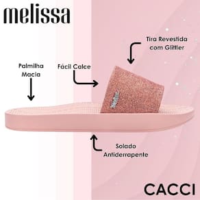 O Chinelo Slide Melissa Sun Sunset Ii é a escolha perfeita para quem ama praticidade e charme. este modelo traz uma tira larga Com glitter que adiciona um toque divertido e cheio de personalidade ao visual.