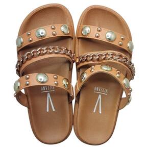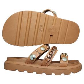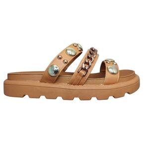 O design arrojado apresenta tachas douradas que adicionam um charme especial e um toque de sofisticação ao calçado. Com tiras largas que envolvem o pé e fechamento em fecho aderente, a papete proporciona um ajuste seguro e fácil. Ideal para combinar com looks leves e descontraídos, como shorts, vestidos e calças de linho.