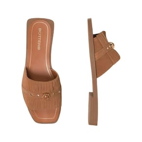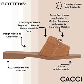 A estrutura conta com tiras largas que envolvem os pés com segurança, proporcionando estabilidade ao caminhar. O acabamento em costura aparente confere personalidade ao design, enquanto o detalhe metálico central adiciona um toque moderno e delicado ao modelo. A base rasteira com aproximadamente 1 cm de altura traz equilíbrio entre leveza e apoio, ideal para quem valoriza bem-estar sem perder sofisticação.