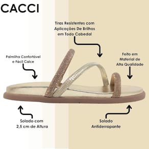 Possui tiras super resistentes, acompanhadas por aplicações de strass que a tornam mais especial e bela, seu solado é antiderrapante e trás muita segurança ao caminhar. Sua palmilha é anatômica e macia, permanecendo sempre o conforto para todas as ocasiões. Leve com você os melhores calçados, vá para todos os lugares e combine looks incríveis com ela. Adquira já a sua Cacci!