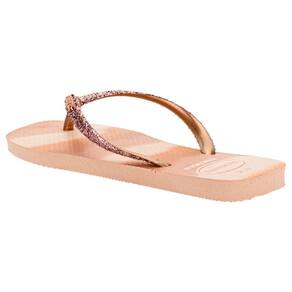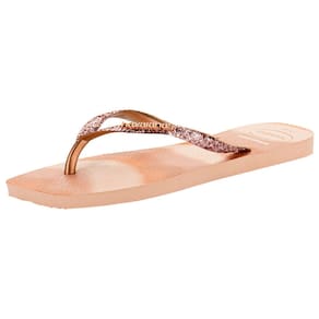 o Chinelo Feminino Slim Square Glitter Party Havaianas 4149417, feitas em borracha com acabamento em glitter para um toque de brilho. Acabamento vulcanizado, palmilha e sola em borracha, garantindo conforto e durabilidade. Perfeitas para adicionar estilo aos seus momentos casuais.