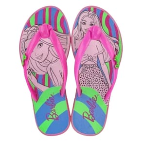 O Chinelo Grendene Barbie Star Infantil Rasteira Rosa Azul é o modelo clássico de flip flop, o chinelo de dedo, com um toque de glamour. Confeccionado em material sintético de alta qualidade e em cores de alto verão para Barbie. A palmilha possui estampa listrada em verde, azul e rosa, além do rosto da Barbie e o logo com seu nome.