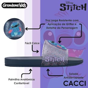 Com o novo Chinelo Slide do Stitch da Grendene Kids, seu filho vai se sentir confortável e estiloso em qualquer lugar, com a diversão e o brilho que só o Stitch pode trazer! Garanta o seu agora e adicione um toque de magia ao dia a dia da sua pequena!