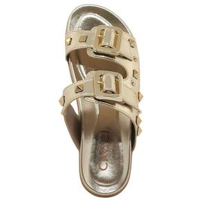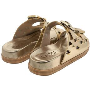 As duas tiras elegantes com detalhes em peças douradas, que adicionam um brilho sofisticado e um toque de charme ao seu visual. tendo um fechamento ajustáveis que permite um encaixe perfeito para os seus pés. Esses detalhes refinados transformam a papete em uma peça chave que combina beleza e funcionalidade.