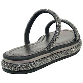 Imagine deslizar seus pés nestes chinelos e sentir imediatamente o toque suave das tiras finas adornadas com pedrarias brilhantes. Cada pedra captura a luz de maneira deslumbrante, adicionando um brilho cintilante a cada passo que você dá.