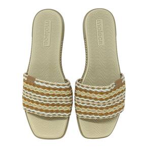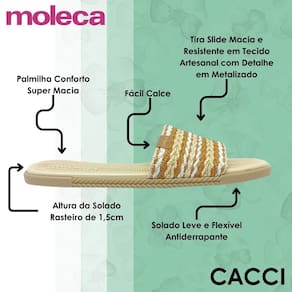 A tira slide macia e resistente é confeccionada em tecido artesanal, com um delicado detalhe metalizado que traz um toque de sofisticação, tornando o chinelo perfeito para diversas ocasiões.