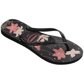 O Chinelo Havaianas Slim Organic é um modelo feminino que se destaca pelo seu design delicado, tiras mais finas (característica da linha Slim) e, no caso da linha "Organic", estampas inspiradas na natureza, como folhagens e padrões orgânicos. A combinação de cores Preto/Cinza/Rosa sugere um solado com base preta ou cinza, e uma estampa que incorpora tons de cinza e rosa, adicionando um toque de feminilidade e suavidade.