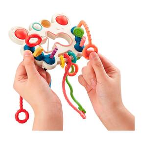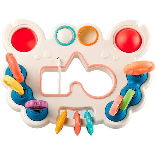 - Anéis móveis que fazem som ao serem agitados, promovendo a percepção tátil e auditiva do bebê;