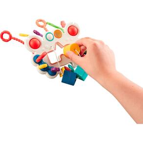 - Chocalho com bolhas (pop-it) que podem ser empurradas e fazem barulho, estimulando a audição e a coordenação motora do bebê;