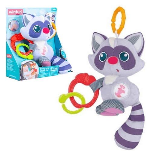 Balance e agite a adorável Guaxinim para sons divertidos. Agite o chocalho e veja as contas coloridas se moverem Pressione o botão iluminado para sons e frases divertidas. Anel de plástico para fácil fixação.