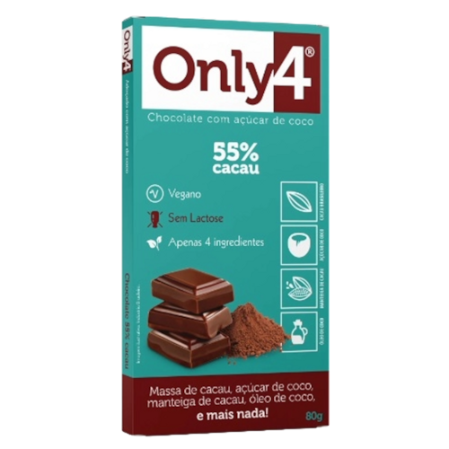 Chocolate 55% Cacau Sem Lactose Vegano Only4 tem em sua composição base apenas 4 ingredientes, é indicada para pessoas que amam chocolates mais leves. Sem adoçantes ou açúcar refinado e mais suave comparado a outras marcas com o mesmo teor.