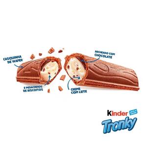 Sobre o Kinder Tronky - Deliciosa combinação de wafer, creme de leite, chocolate e biscoito. - Embalagem individual perfeita para lanche ou acompanhamento do café ou chá. - Marca renomada da Ferrero da Itália.