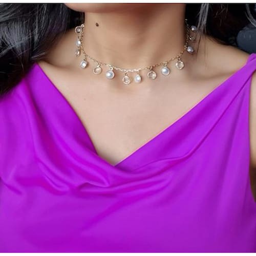 Choker Com Pedras Cristal e Perola Delicado Folheado A Ouro 18k