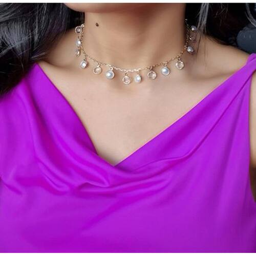 Choker Com Pedras Cristal e Perola Delicado Folheado A Ouro 18k